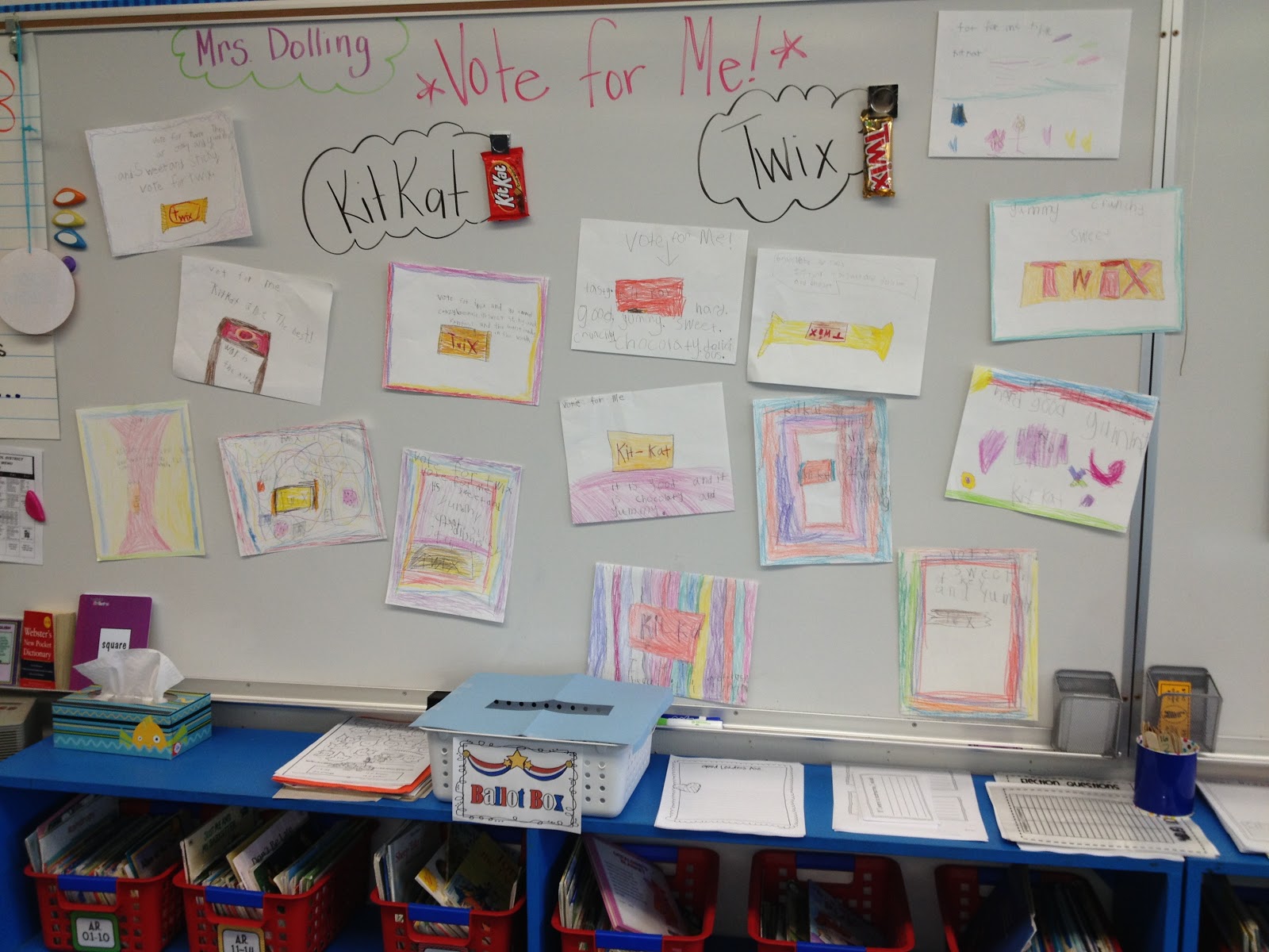 I wasn’t about to touch the presidential candidates with a 10-foot pole, so we went for candy bars instead. Across the Hall’s Candy Bar Election pack was one amazing unit. I mixed it in with Teaching In High Heel’s Hooray for Election Day pack (another amazing election collection) for the perfect first grade mix! We hosted primary elections and found that Twix and KitKat were the two squaring off. Then we made campaign posters, wrote speeches (well . . . more like one or two liners . . . hehehehehe), completed voter identification cards, and hosted an official election. It was glorious I tell you. Check out our photo montage below – the kids were in their glory.