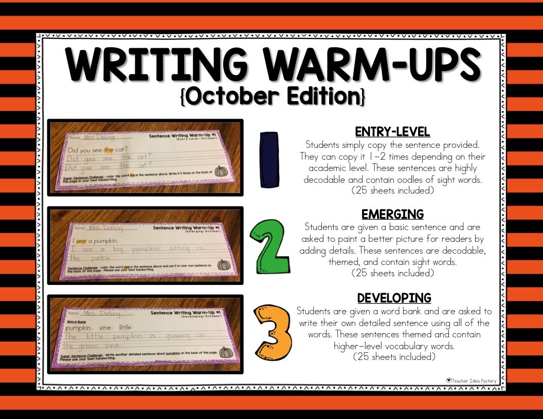 I also managed to pump out my Sentence Writing Warm-Ups for October. Sorry for the delay on this set . . . I had quite a few emails asking when they would be posted.  Well, they are finally up – under the wire ๐Ÿ™‚  This set was also added to the Growing Bundle.