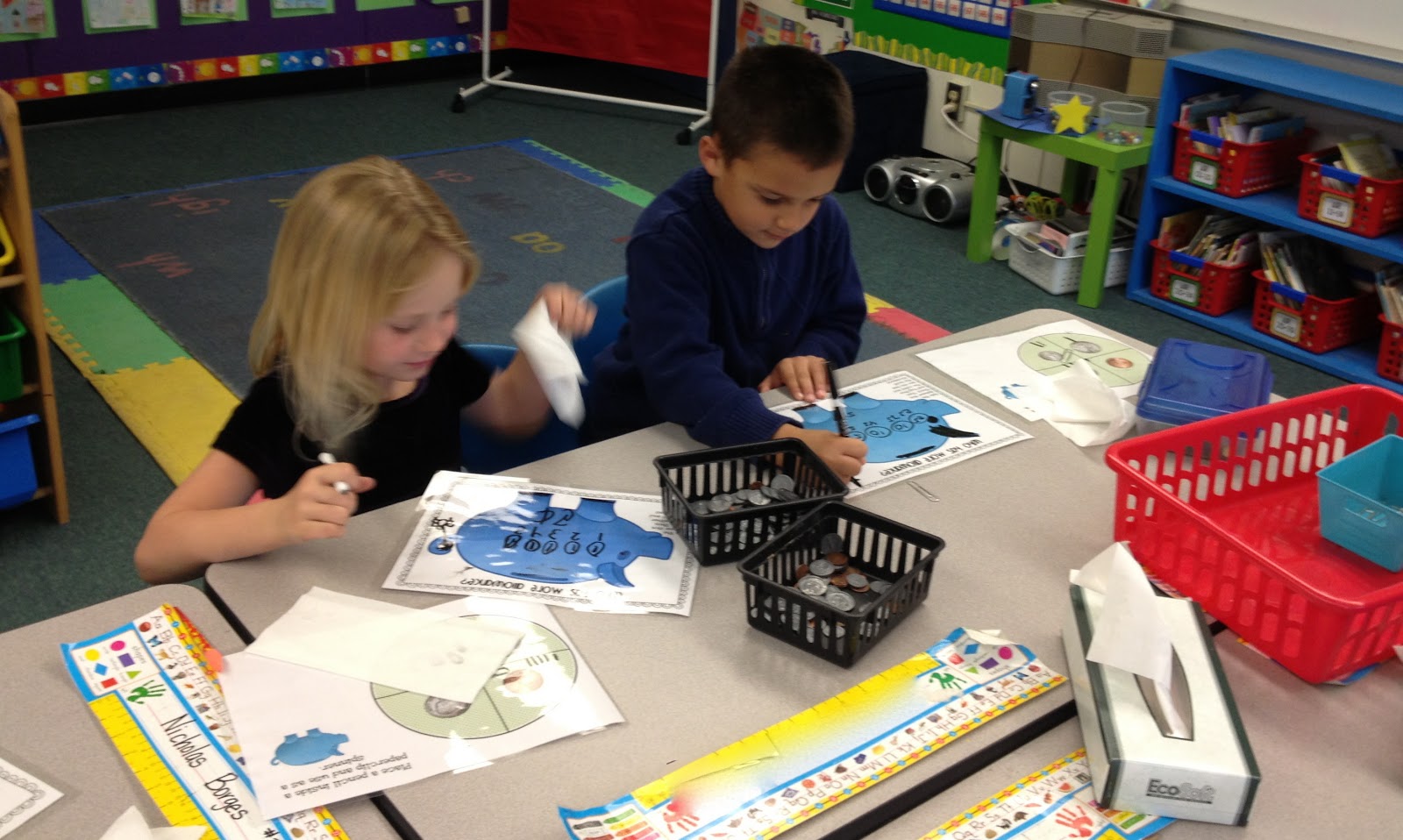 We finished up our money unit this week and one math center in particular proved to be an AMAZING hit with my babes. Jennifer Tice from Rowdy in First Grade delighted my money makin’ fools with her Who Has the Most Allowance Game. Uh . . . we loved it soooooo much that we played it TWICE this week. Thanks bunches Jennifer ๐