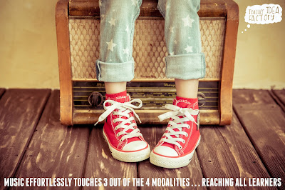 Let me back up fora moment and explain why music is such a powerful classroom tool. Think about how our students process information for a moment. We have visual, auditory, kinesthetic, and tactual/emotional learners in our rooms. As educators, we are no strangers to striving to develop well-rounded lessons that tap into all of these modalities.